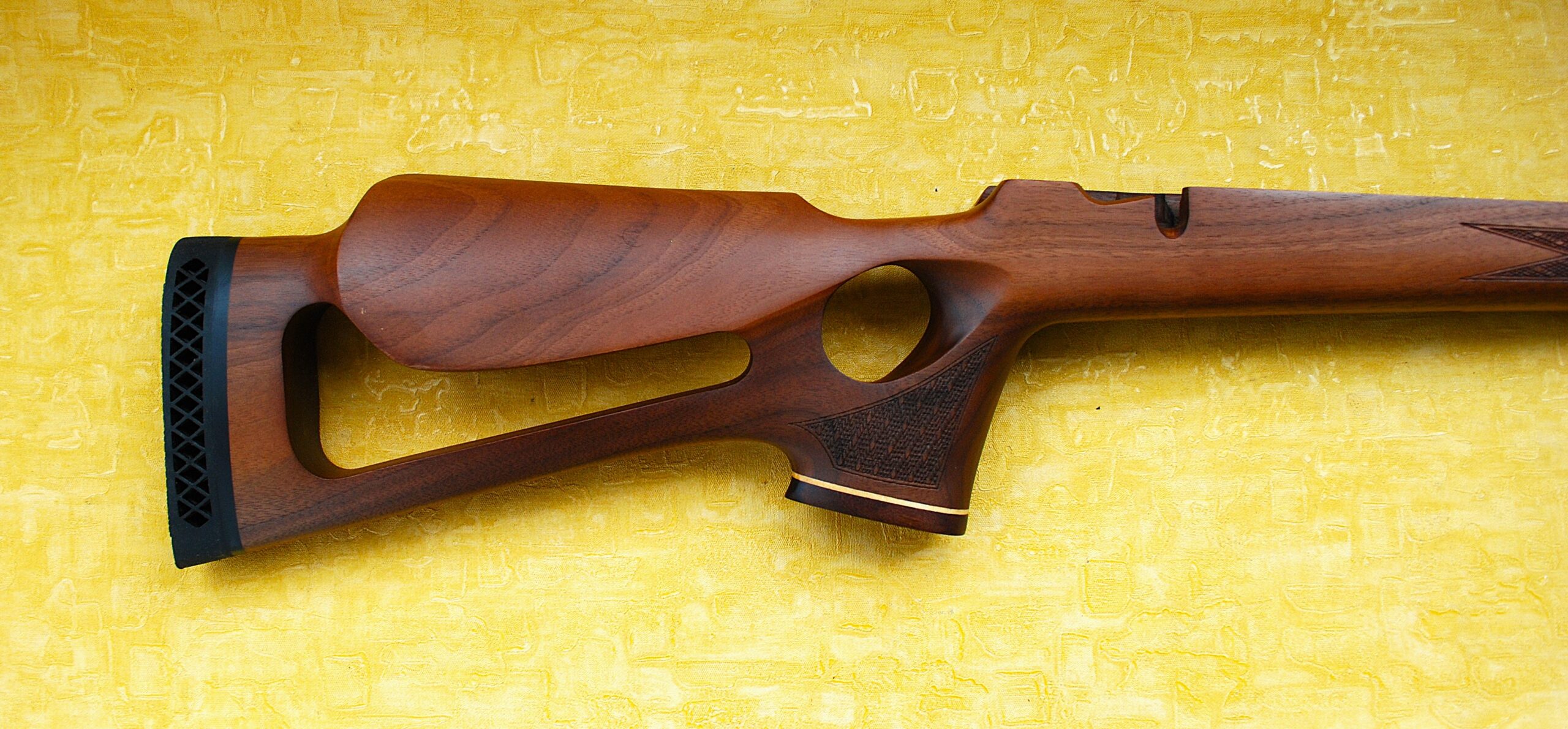 BRAND NEW Skeleton AND Standard Style LEFT HANDED Thumb Hole Deluxe Stocks. To drop a standard RIGHT HANDED Anschutz 1416 and 1417 Bolt Action .22 or .17 HMR calibre Rifle straight in. Fox Cut or Skip Chequering is always a nice feature to set a stock apart. As is a Rosewood Grip Cap with White Spacer. Highly Decorative Walnut with Good Pattern and Cross Grain Highlights.