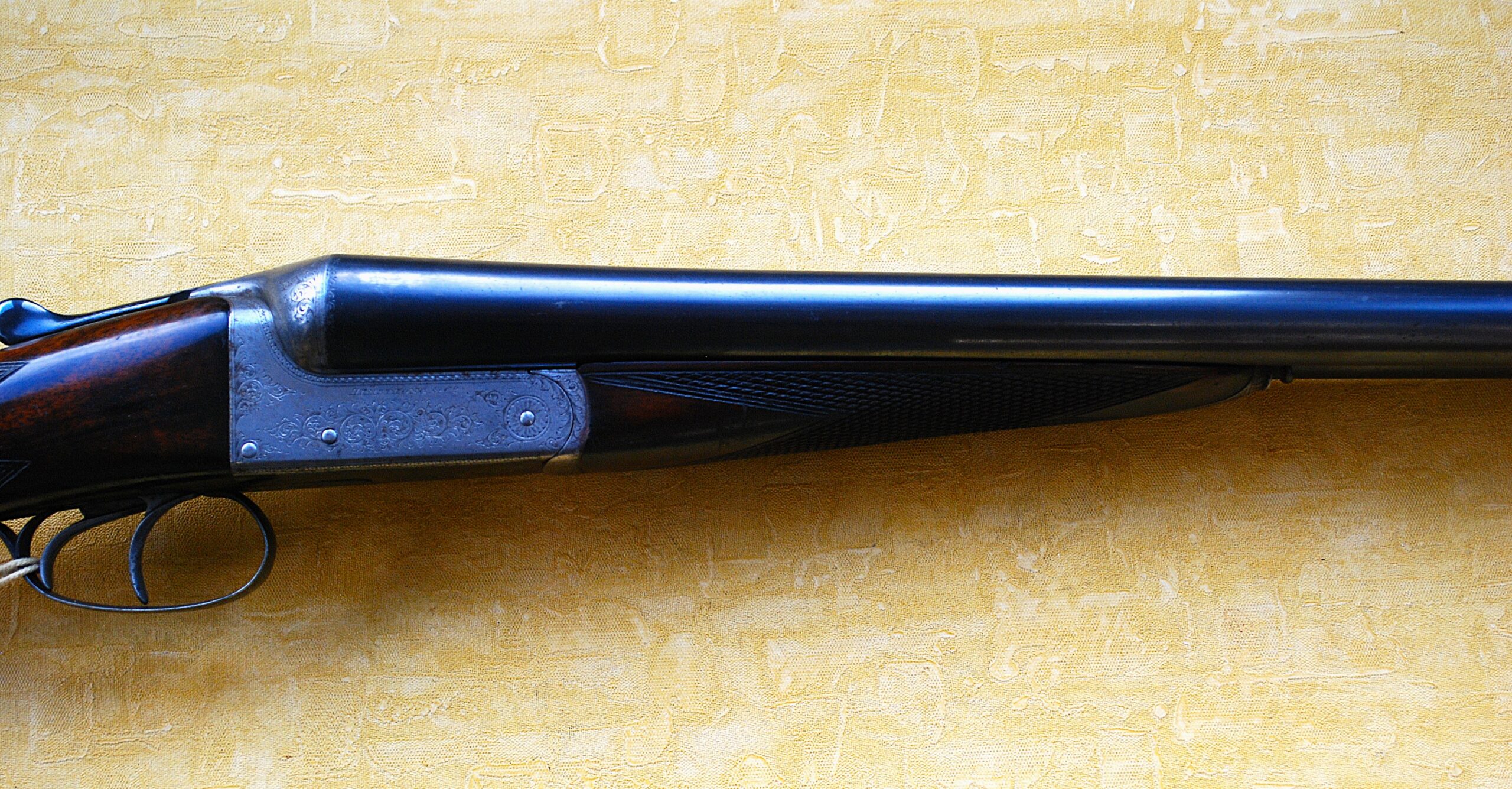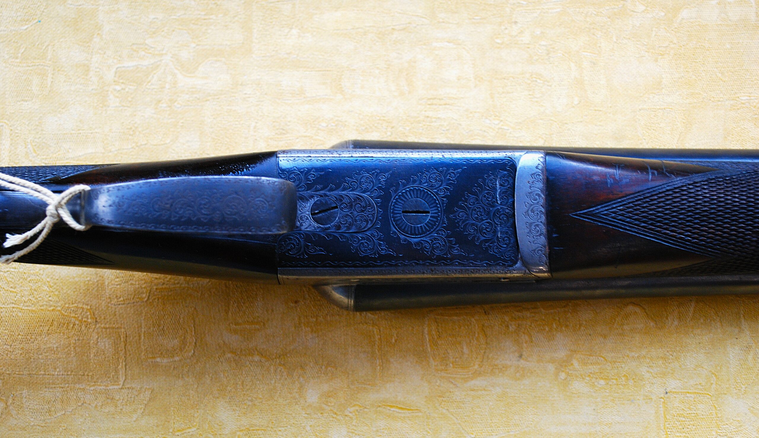A STRONG TREBLE Bite Boxlock Action with Twin to the bottom plus additional Cross Action Bolt to the top. Decorated with Hand Cut Scroll and Border Engraving. Right around, including the Contrasting Gun Blued / Black Trigger Guard, Bottom Tang and Top Lever. Also, the Bottom Plate.