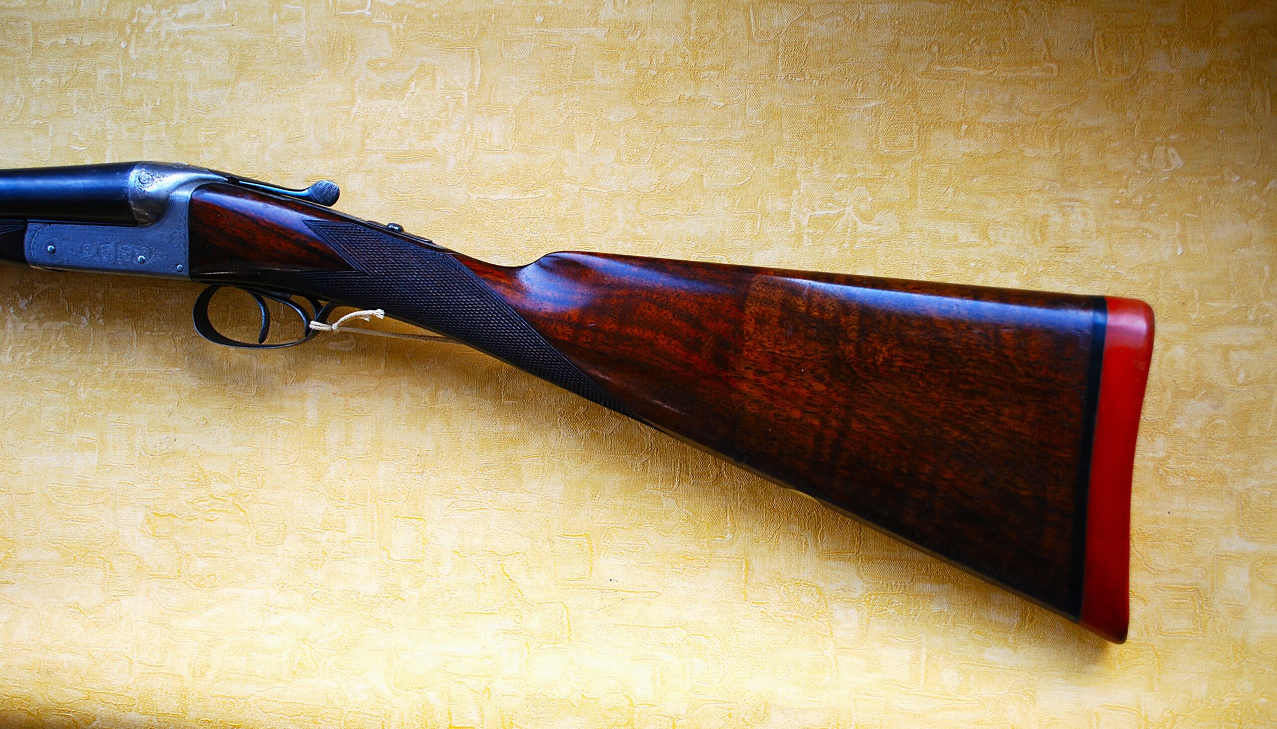 Original English Strong Straight Grained Walnut Stock with some Excellent Cross Grain Tiger Stripe Highlights too. Especially when the light catches it properly. Concave ½ (25mm) Red Recoil Pad with contrasting Black Spacer / Base. Chequering is not far from New still too. Still with an unused Flush Inlet Oval Escutcheon ready for (YOUR) initials etc. Maker’s name and details to the Sunken Concave Rib as well as each Side of the Action.