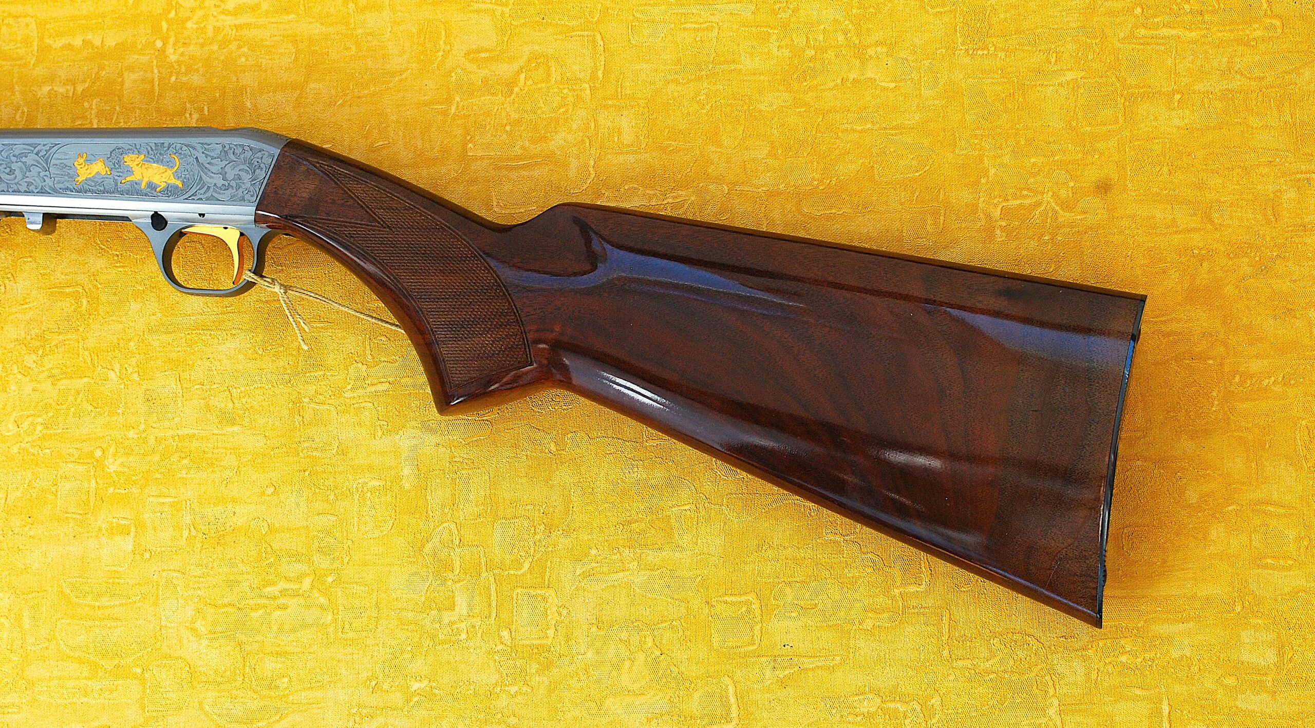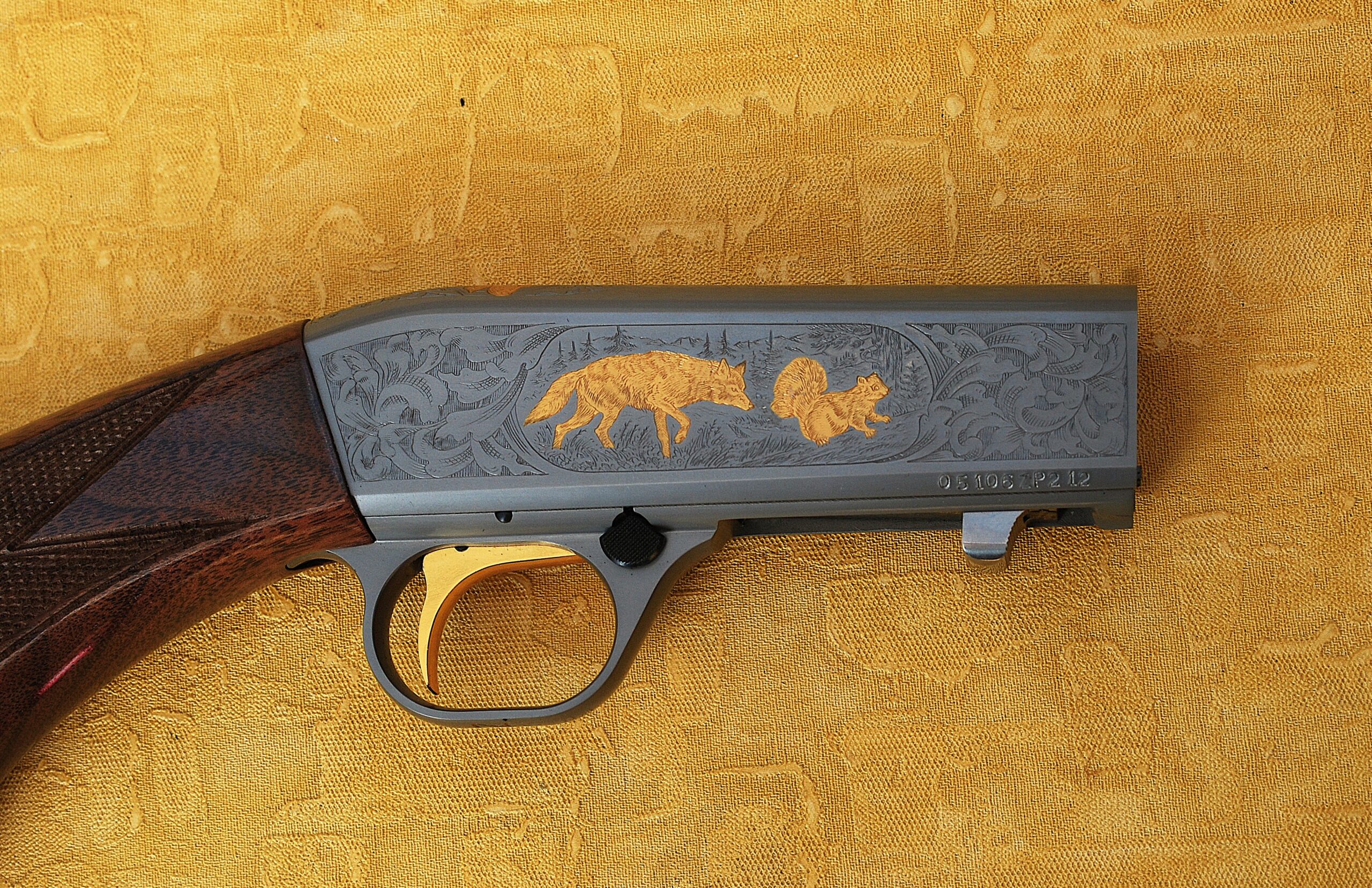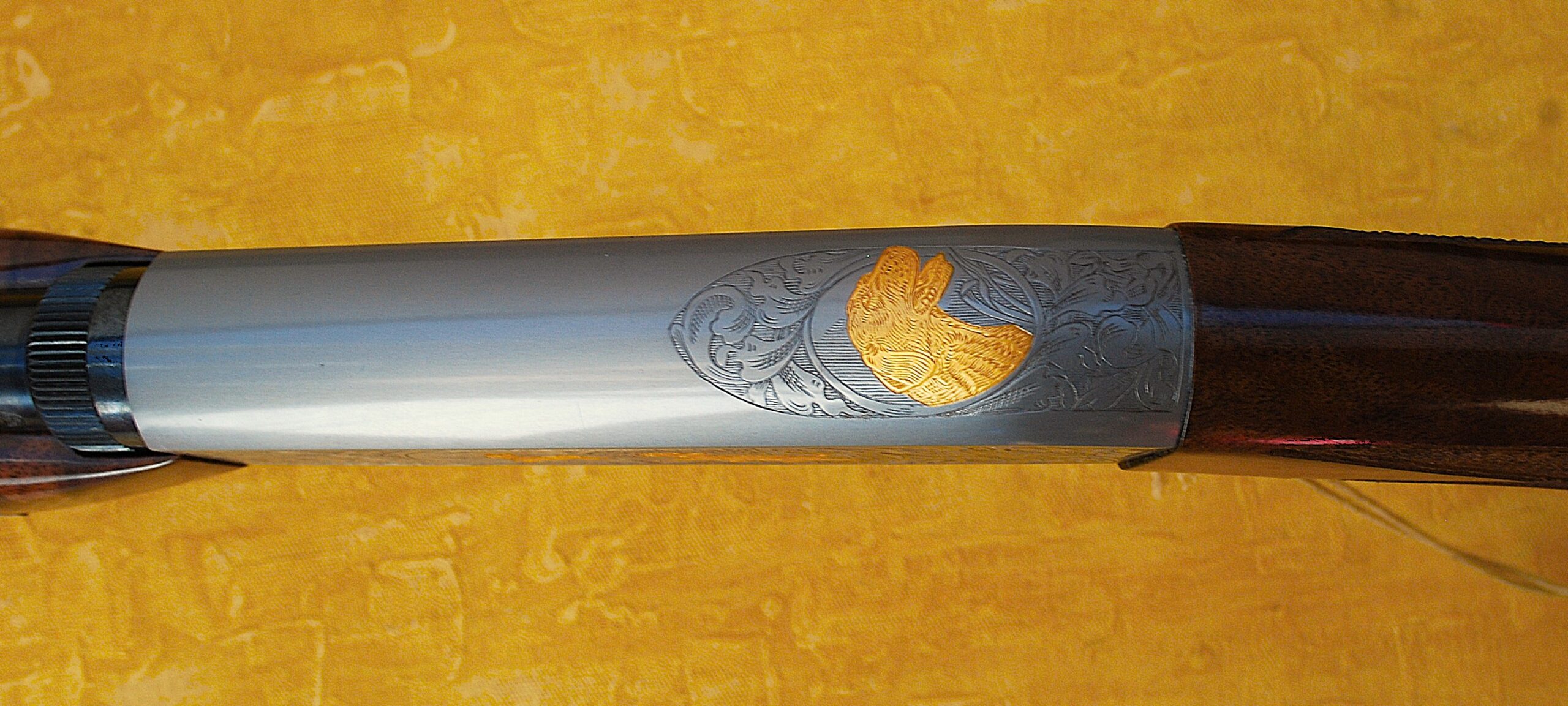 These come with a Grey Nitrite finish to the barrel and action. Also Custom Shop Engraved and Inlayed. Each action face has a Foliage pattern design which also adorns the top rear section. Set within the pattern is a Dog (looks more like a Wolf) chasing a Rabbit to the Left Side. A Fox and Squirrel to the right and a Retriever Dogs Head and neck to the top. All highlighted and finished in ‘Gold’.