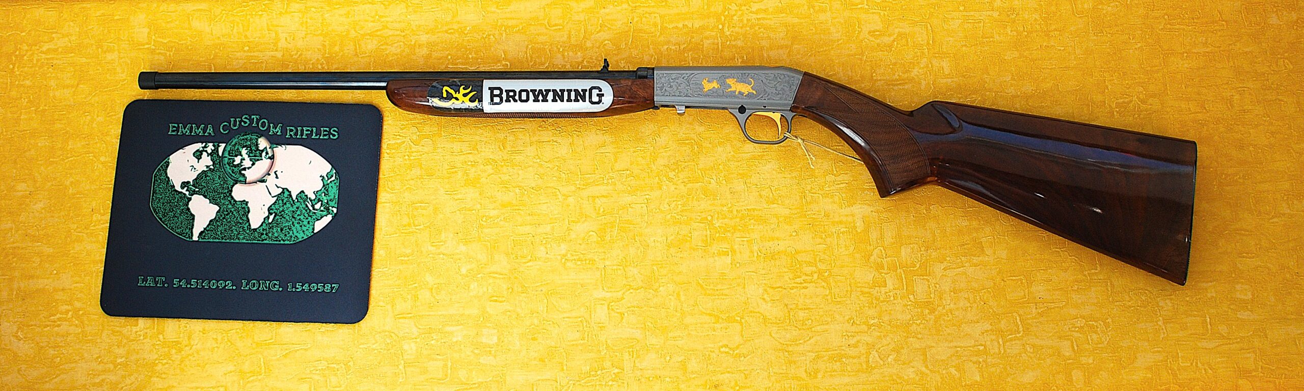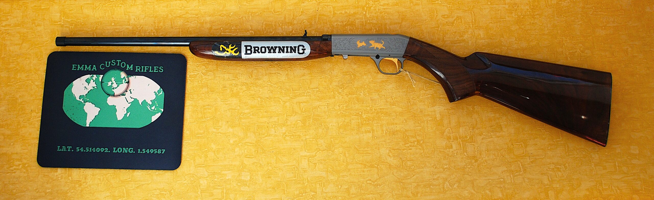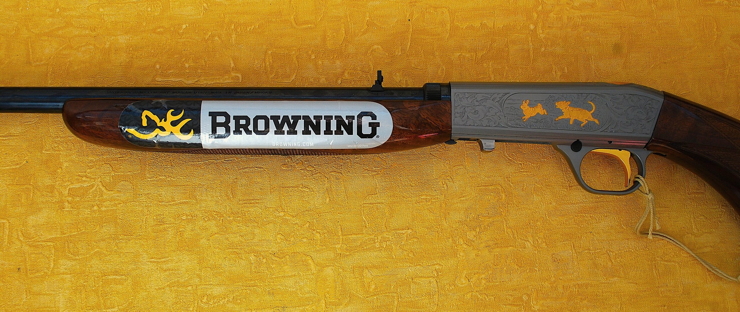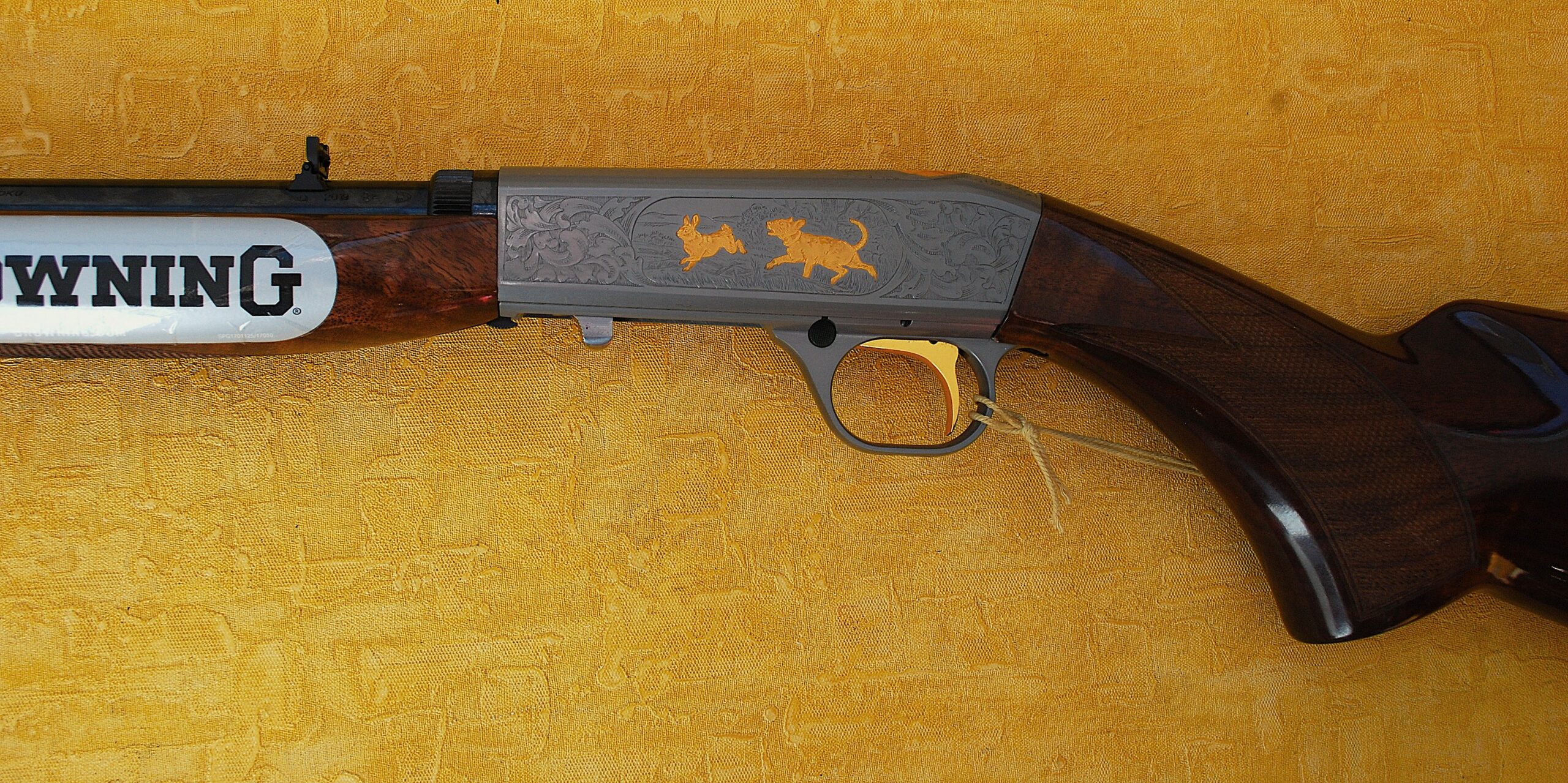 These come with a Grey Nitrite finish to the barrel and action. Also Custom Shop Engraved and Inlayed. Each action face has a Foliage pattern design which also adorns the top rear section. Set within the pattern is a Dog (looks more like a Wolf) chasing a Rabbit to the Left Side. A Fox and Squirrel to the right and a Retriever Dogs Head and neck to the top. All highlighted and finished in ‘Gold’.
