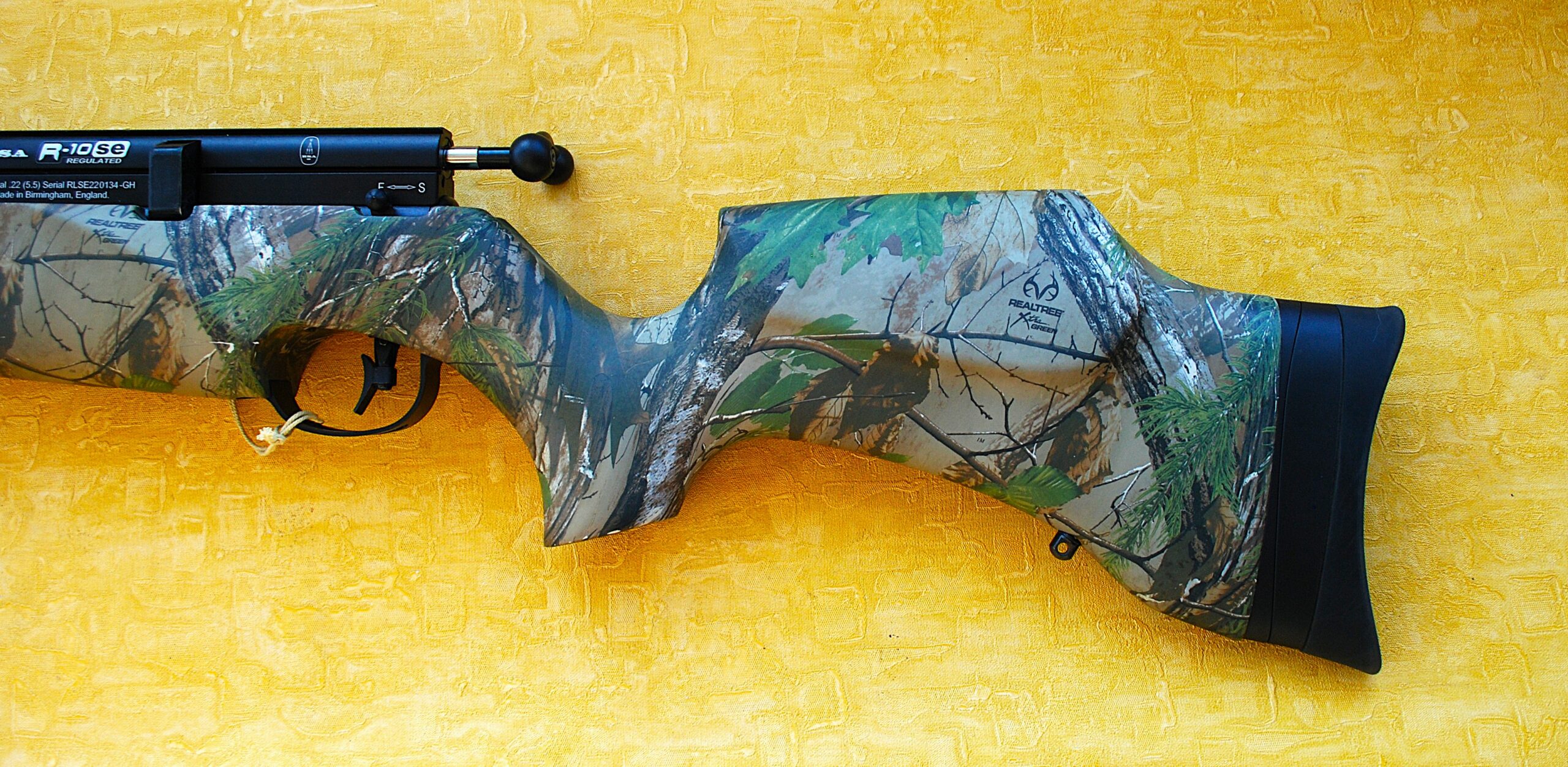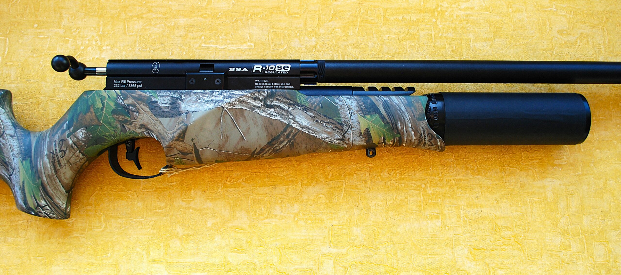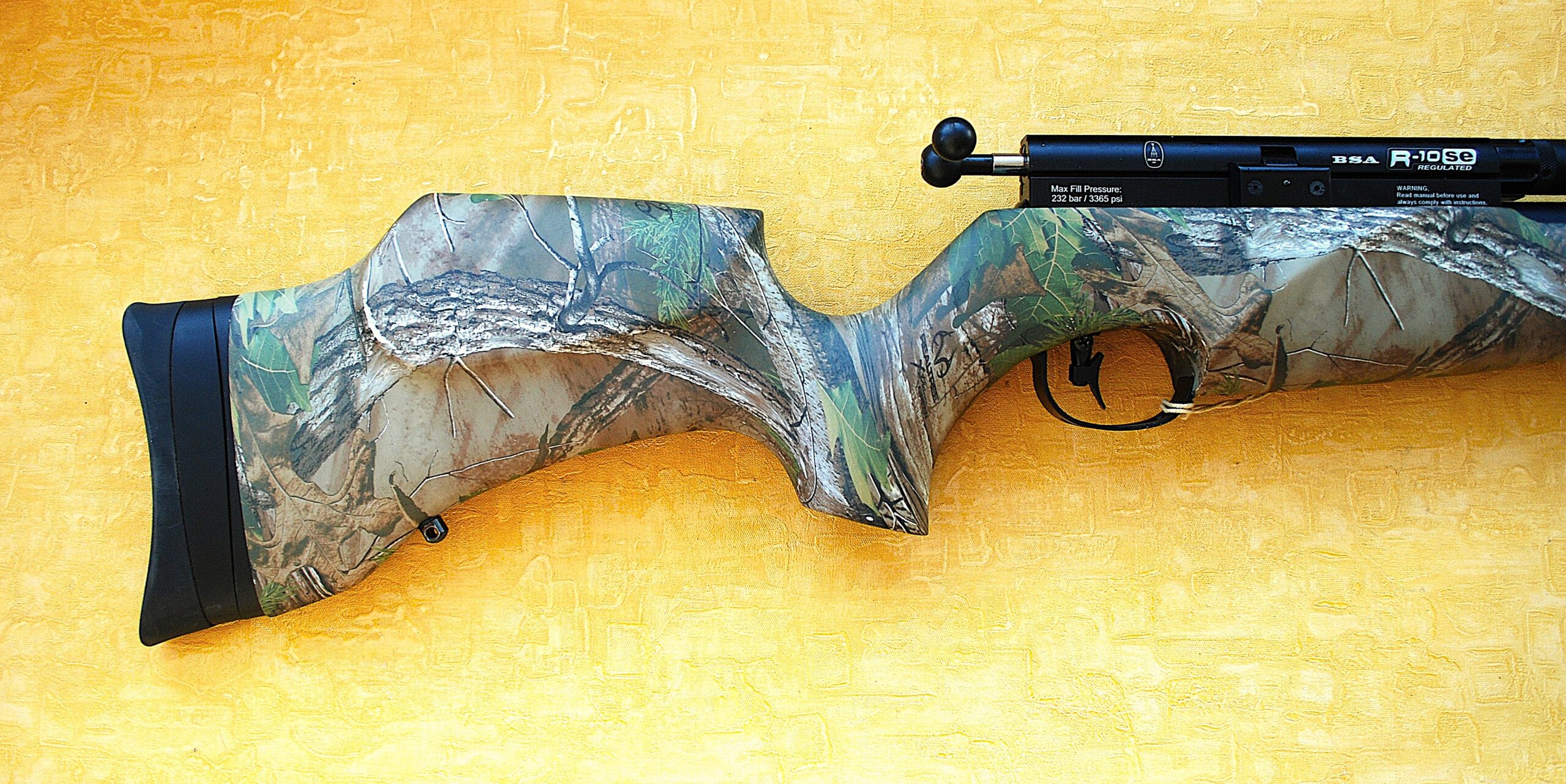 Full Real Tree Camo Pattern Synthetic Stocked BSA .22 (5.5mm) R10 Bolt Action PCP (Firearm Rated) Air Rifle. All in an Anti-Slip finish throughout for a positive hold in any conditions.