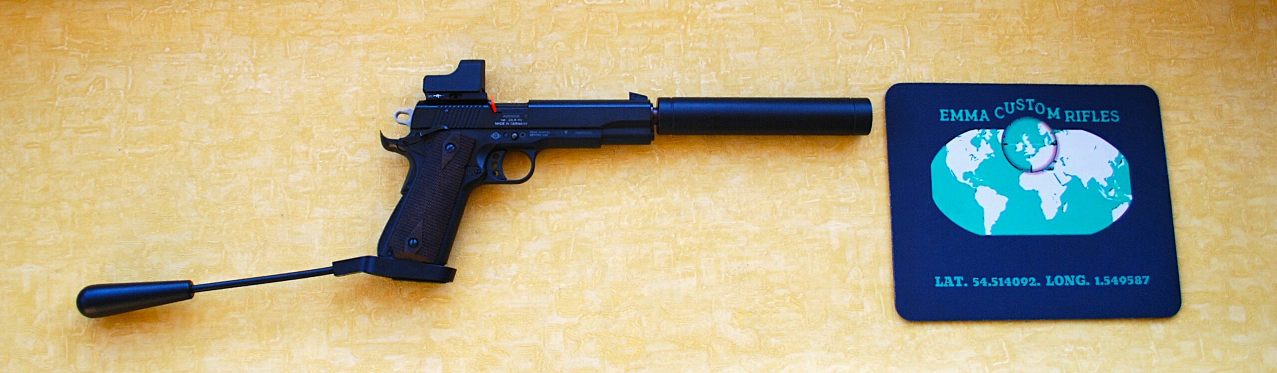 Completely UK legal .22 Rim-Fire Pistol in Full Long Barrel Spec. / Format. Pistol Grip Extension Bar and Long Barrel taking it past the minimal overall length restrictions. Overall length comes in at 24 1/4″ (640mm) and tips the scales as pictured (WITH sight) at 3 Lb 9 ¾ oz (1.636 Kg).