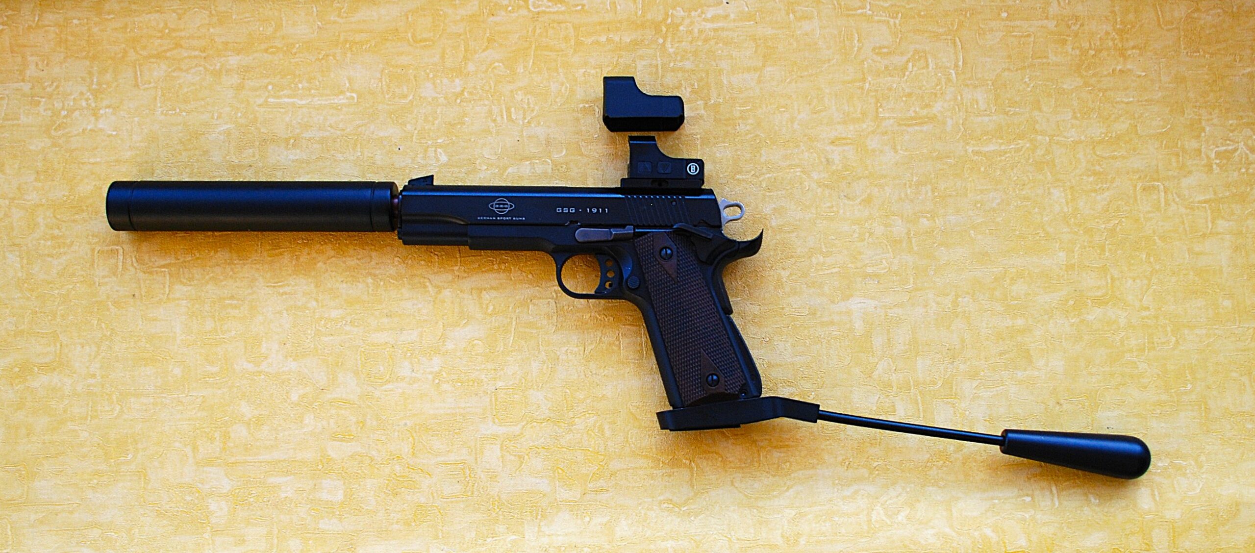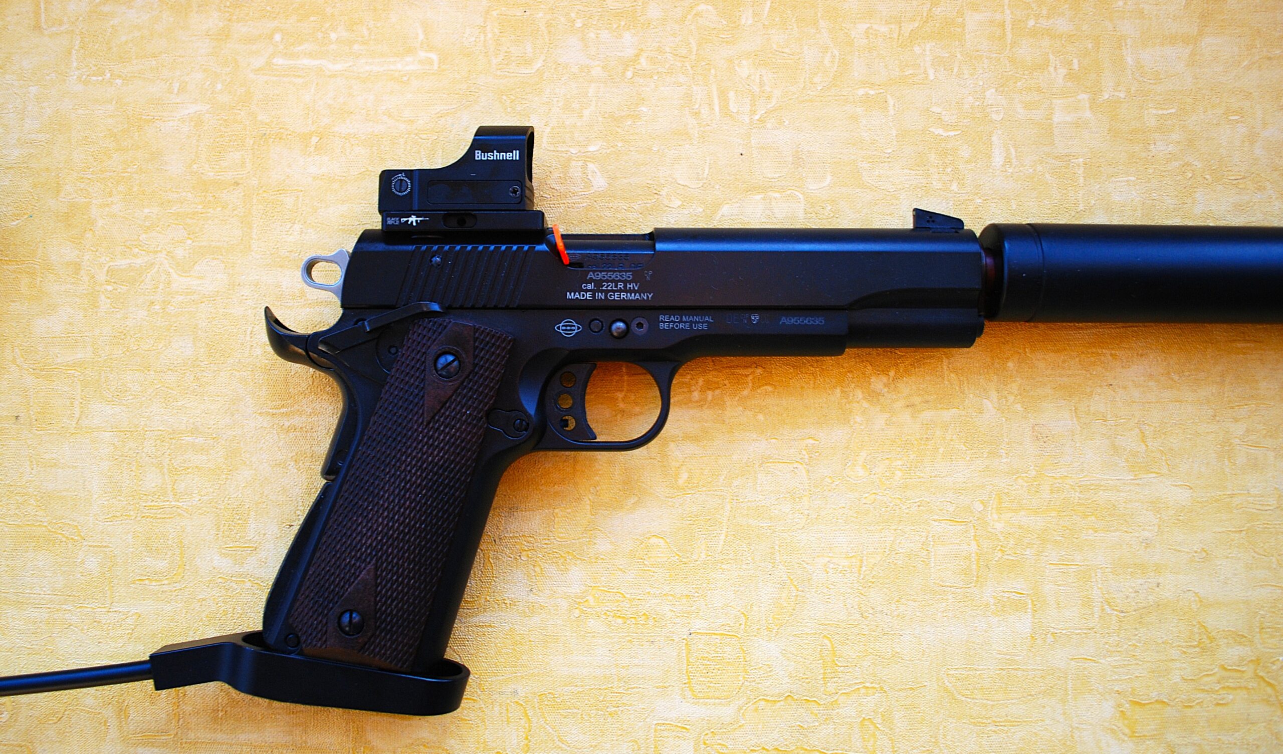 German Sports Guns (GSG) GMBH Long Barrel Pistol (LBP) 1911 RX100 Package in .22 rim-fire. This INCLUDES the Reflex Mount and Dedicated Bushnell GSG-1911-RDM RX100 1x25mm RED DOT Target Sight.