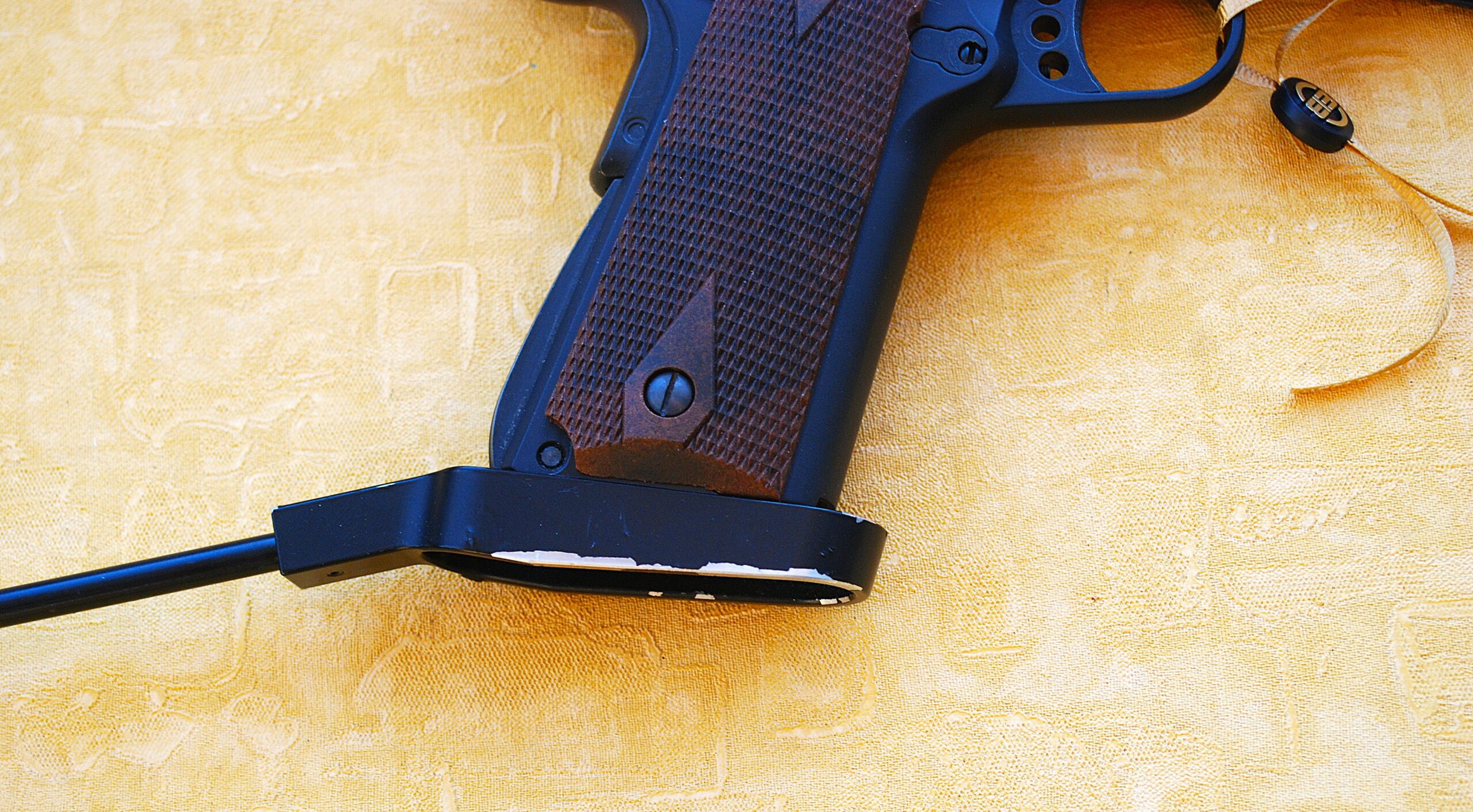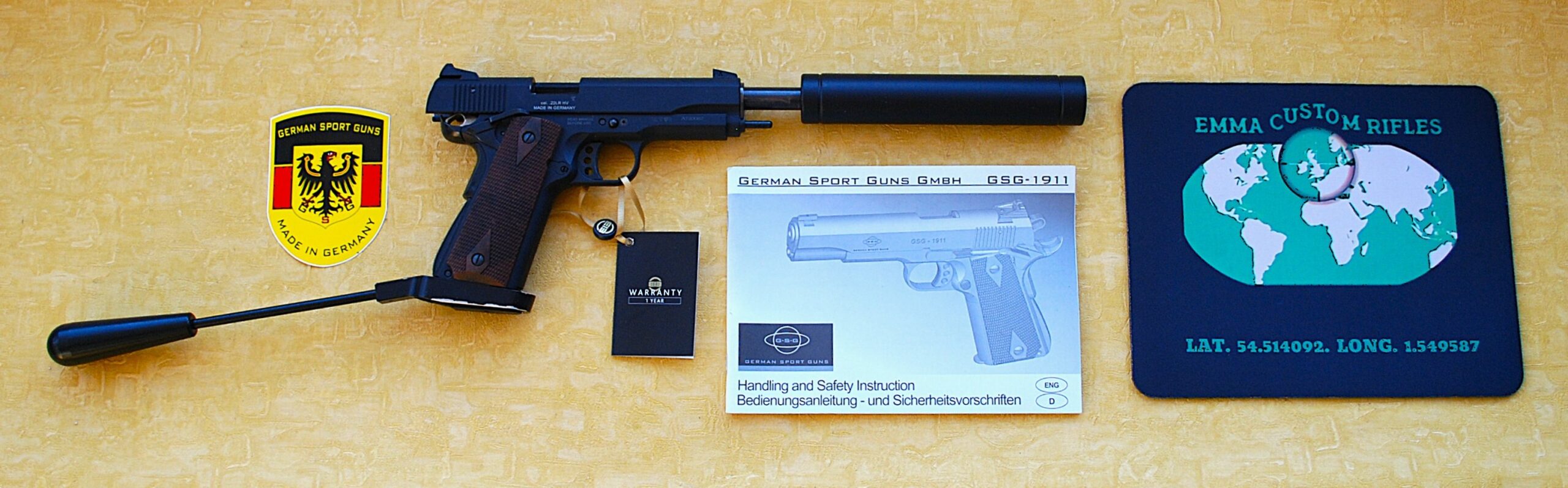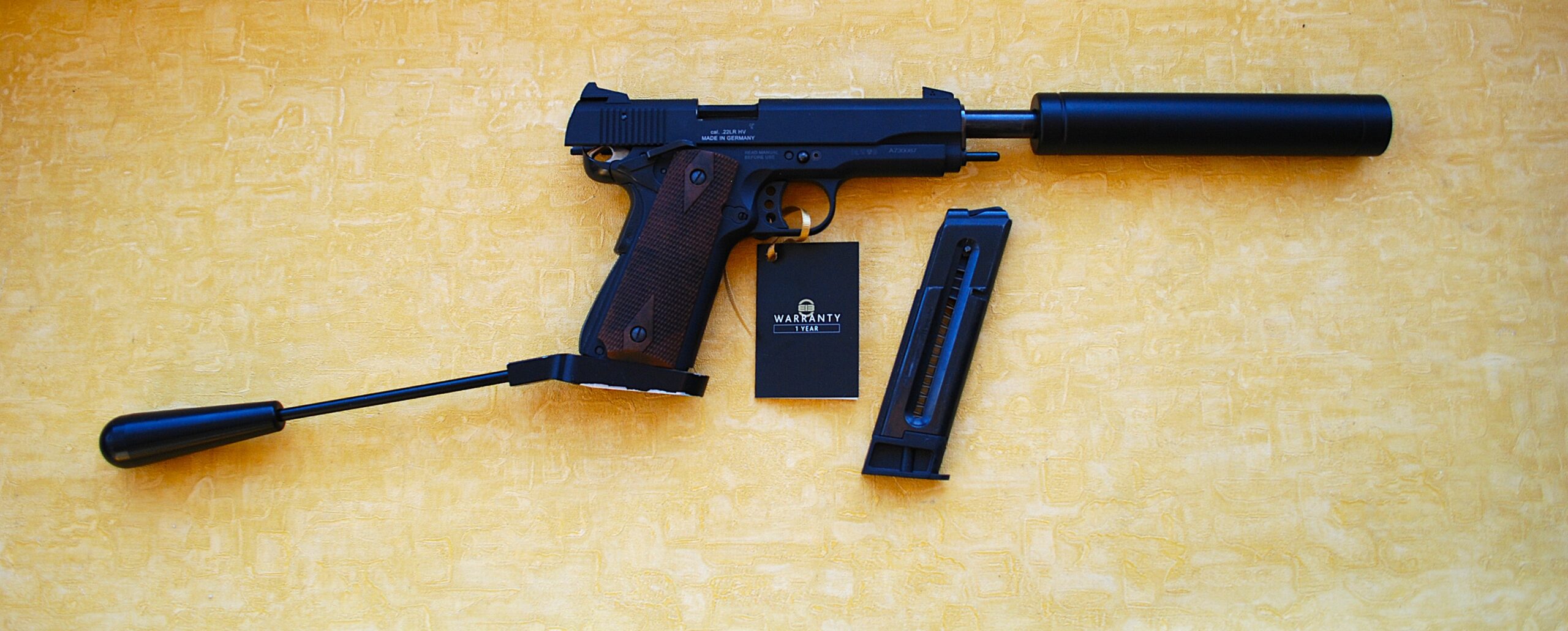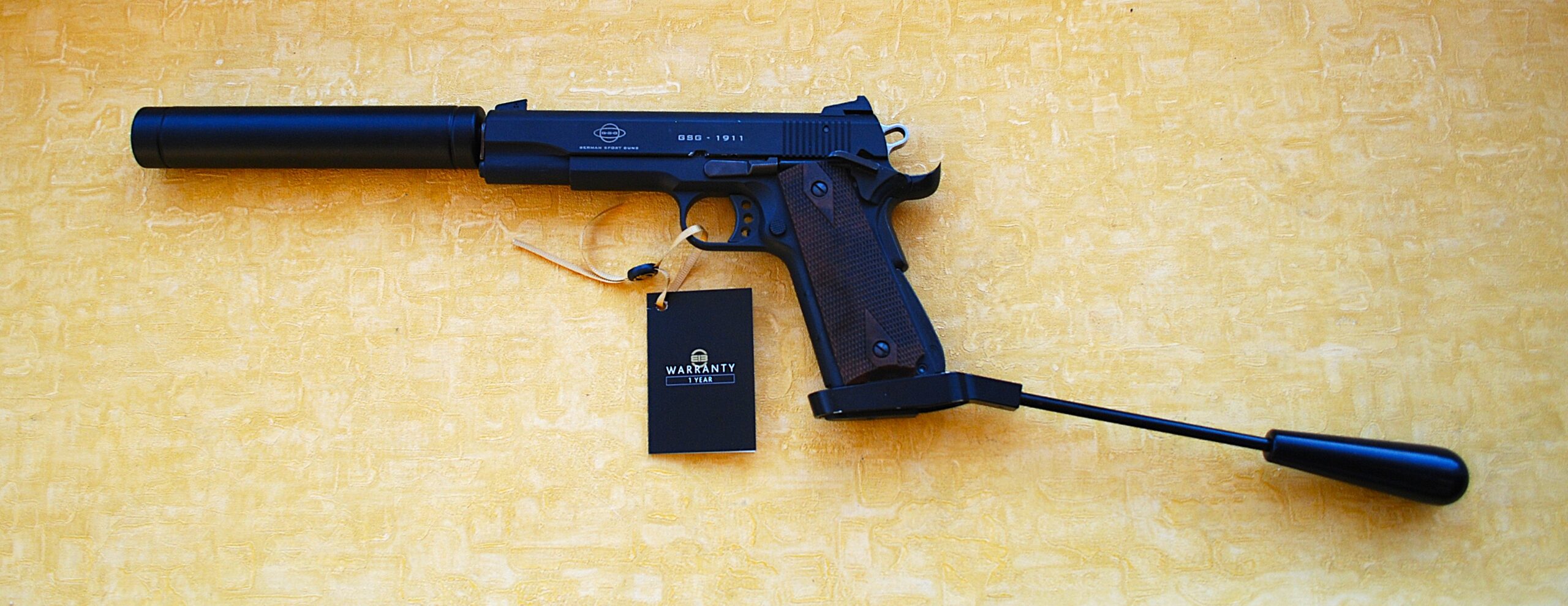 GSG – German Sporting Guns 1911 Long Barrelled Semi-Automatic .22 Rim-Fire Pistol. This is a UK legal .22 Rim-Fire Pistol in Full Long Barrel Spec. / Format. Pistol Grip Extension Bar and Long Barrel taking it past the minimal overall length restrictions. 12” (30cm / 300mm) and 24” (60cm / 600mm) Overall. This finishing at 24 ½” (620mm) so room to spare.