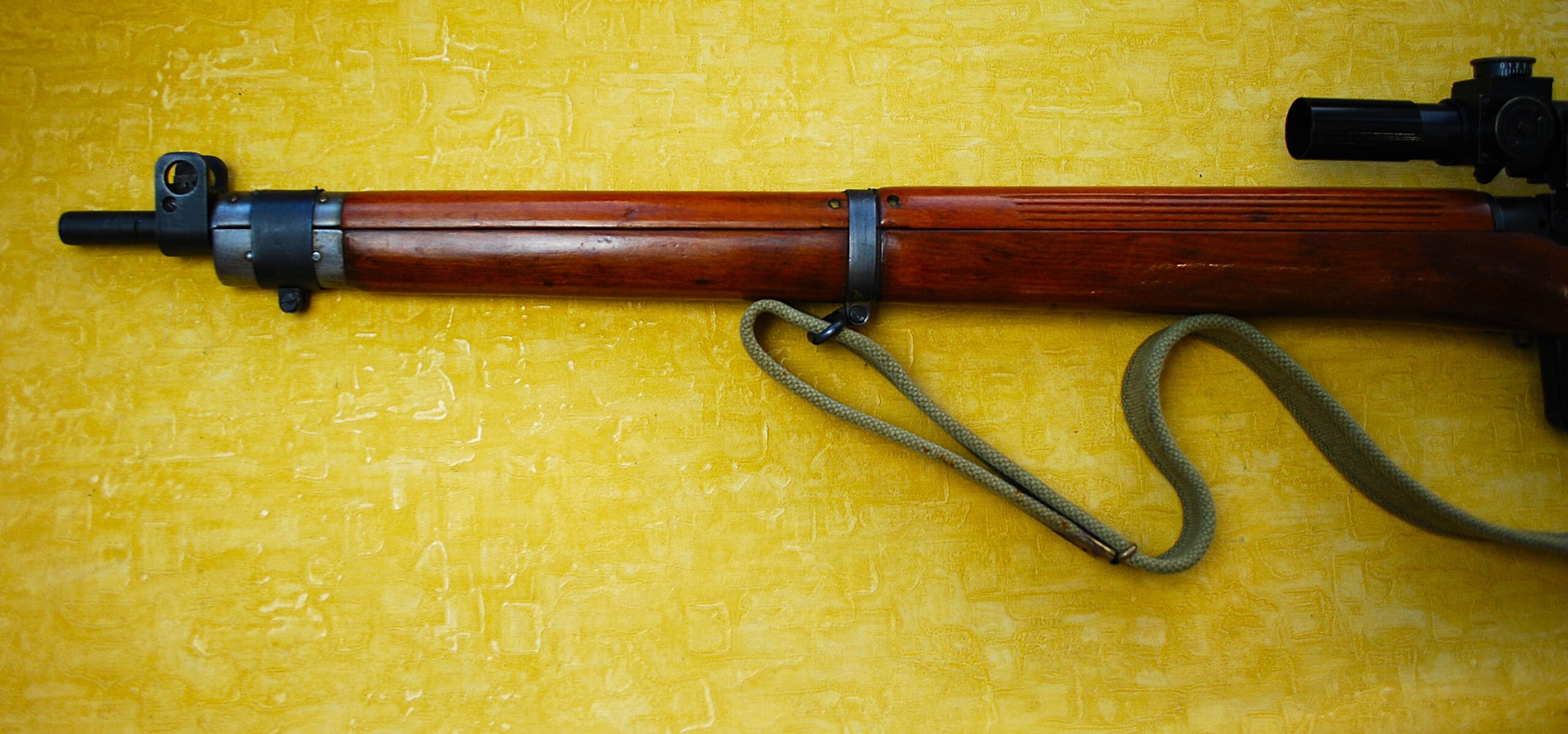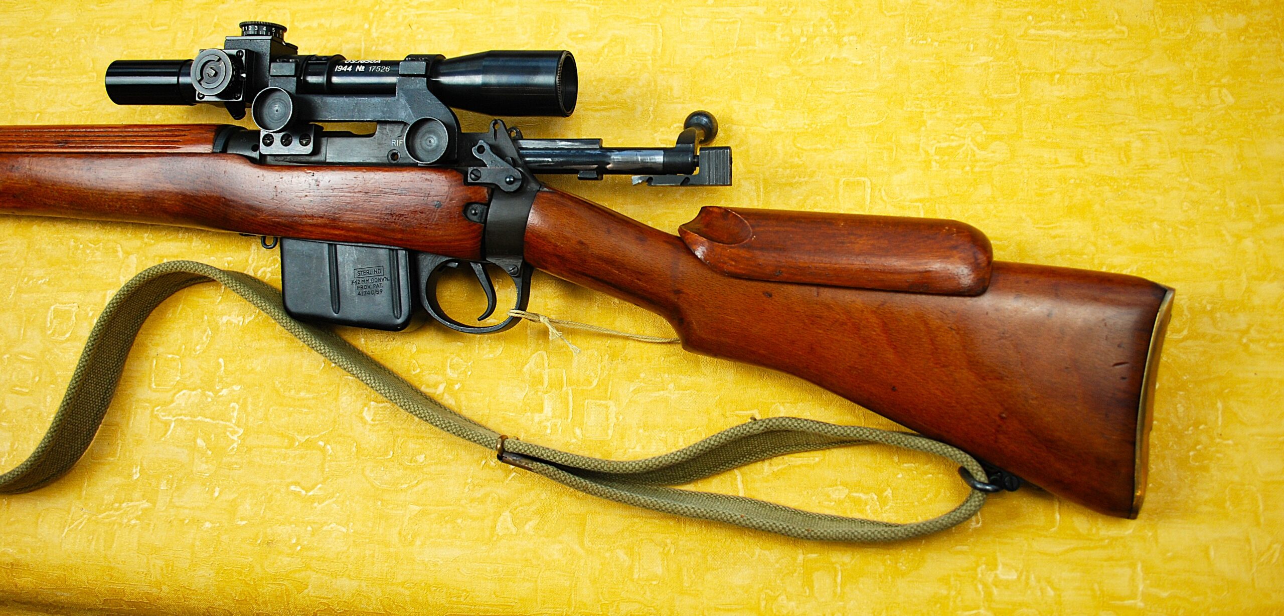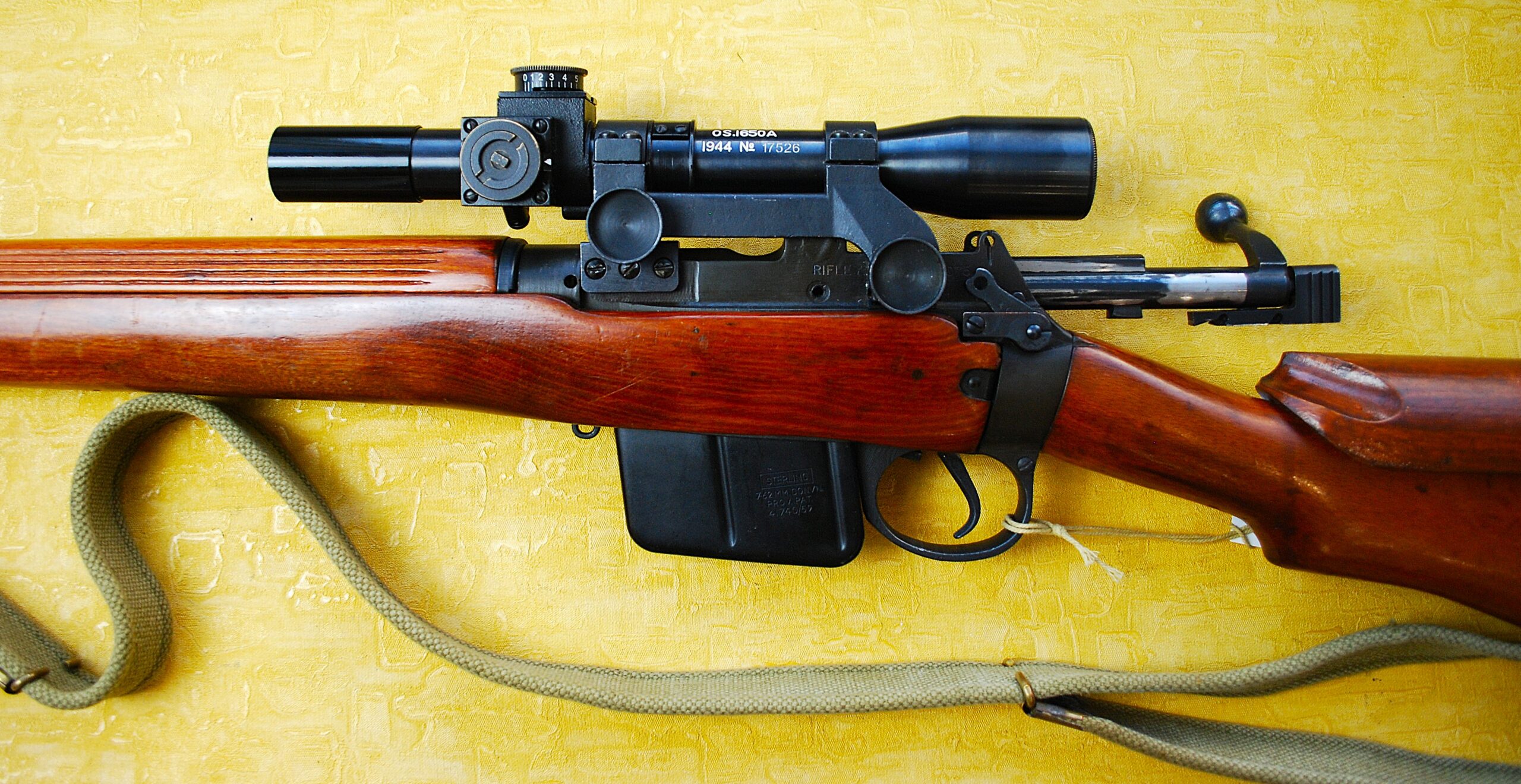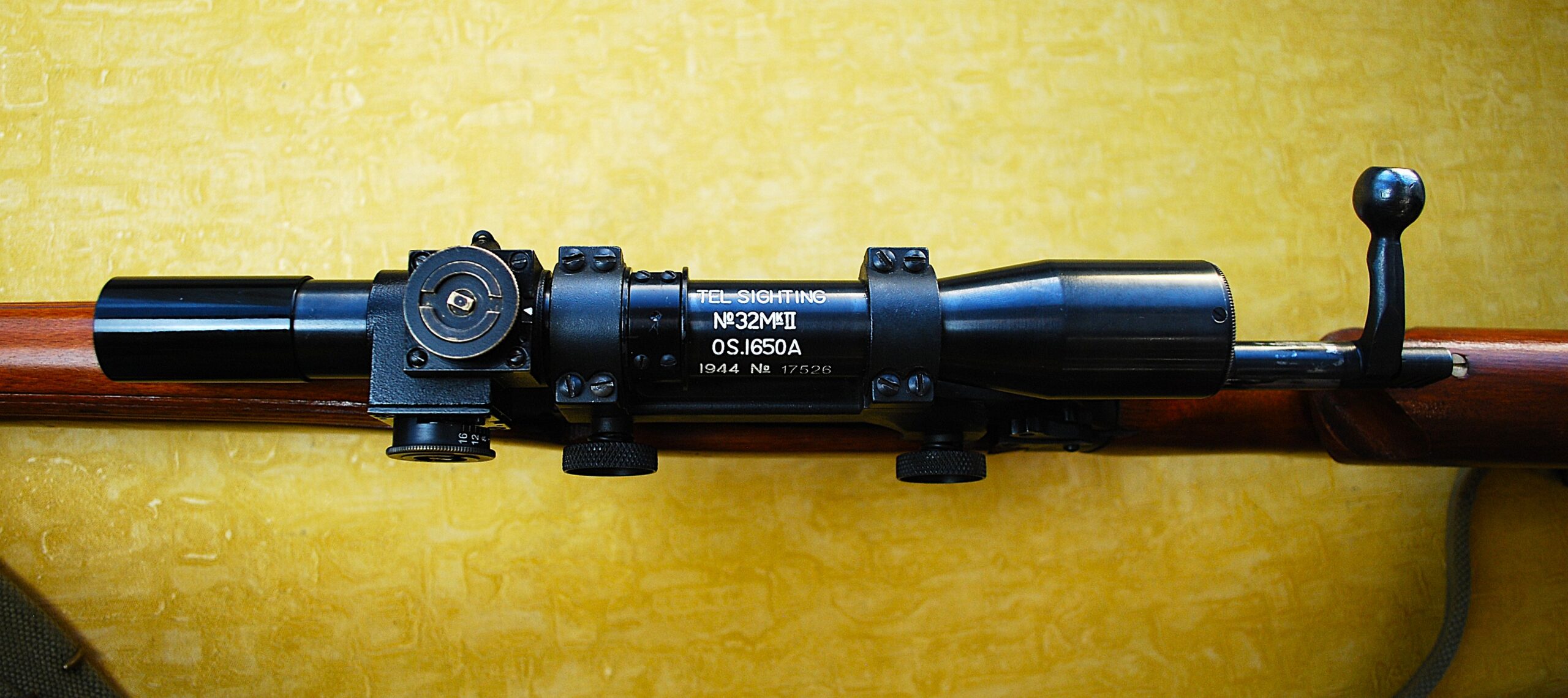 As showing, the rifle is fitted with (I ASSUME) one of the American made original / correct Rifle Scope copies. Fully Detailed and still BRIGHT WHITE with TEL. SIGHTING No. 32 MKII OS 1650A 1944 No 17526. I would LOVE to find out it’s a true original. Given condition it would have had to be hermetically sealed in a storage tube for the last 80+ years! Equally possible it too is a Full and equally Excellent restoration. Attached in its CORRECT Quick Detachable Side Mount Bracket. Post and Fine Wire Cross Hair Reticle. Though, admittedly, the wire is not THAT fine. Just nowhere near close to the width of the main post.