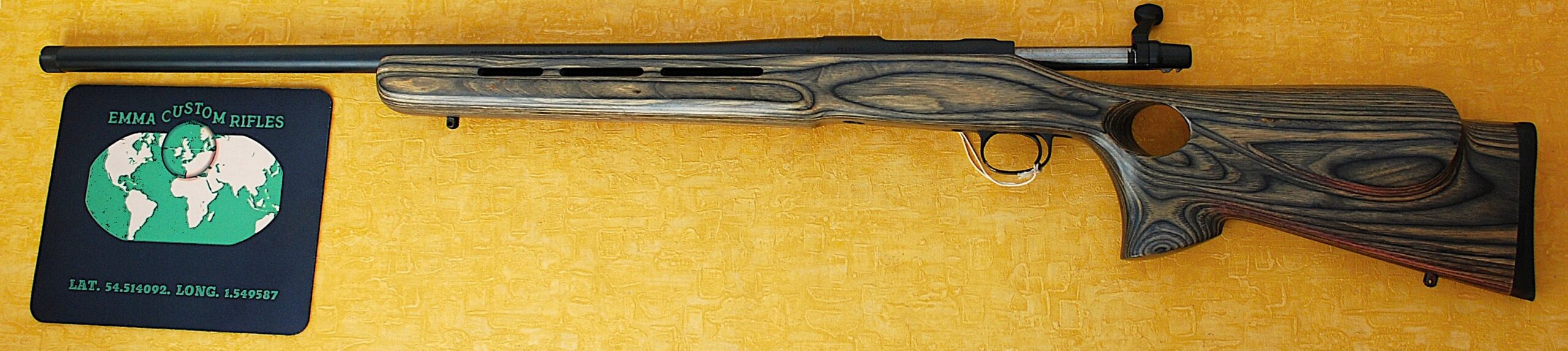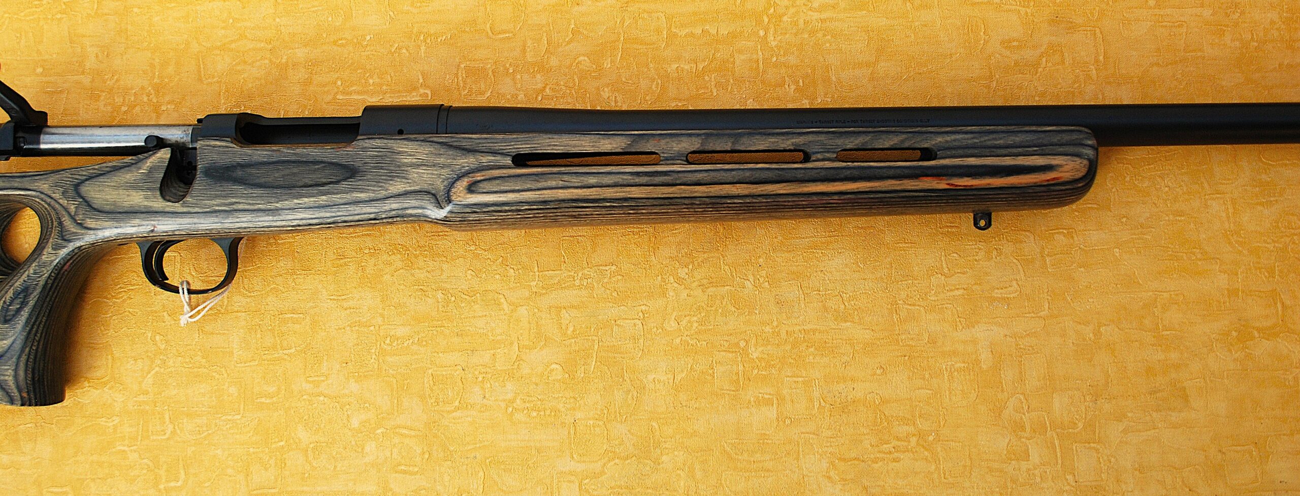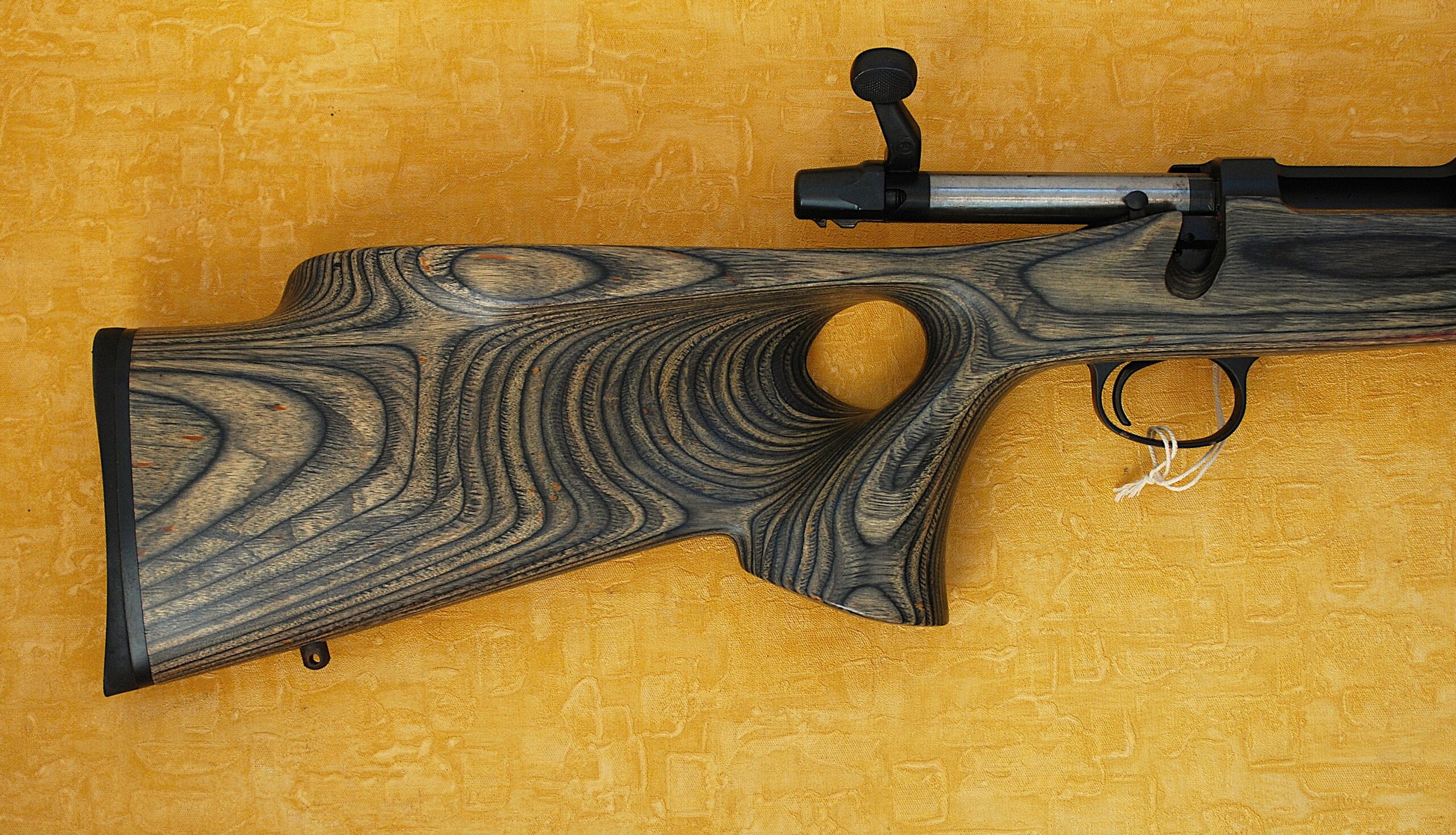 Grey / Green (ish) Right-Handed Thumb Hole Laminated Stock. 13 ½” (343mm) pull given an Overall length of 44 ¾” (1137mm). Scales trip out at an once over 10 lb dead (4.567 Kg) bare weight. Ventilated For end too.