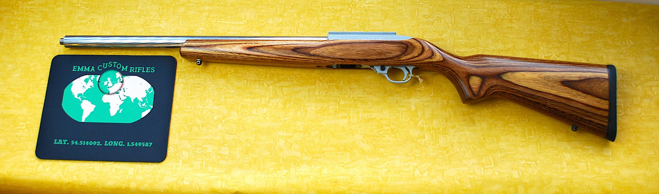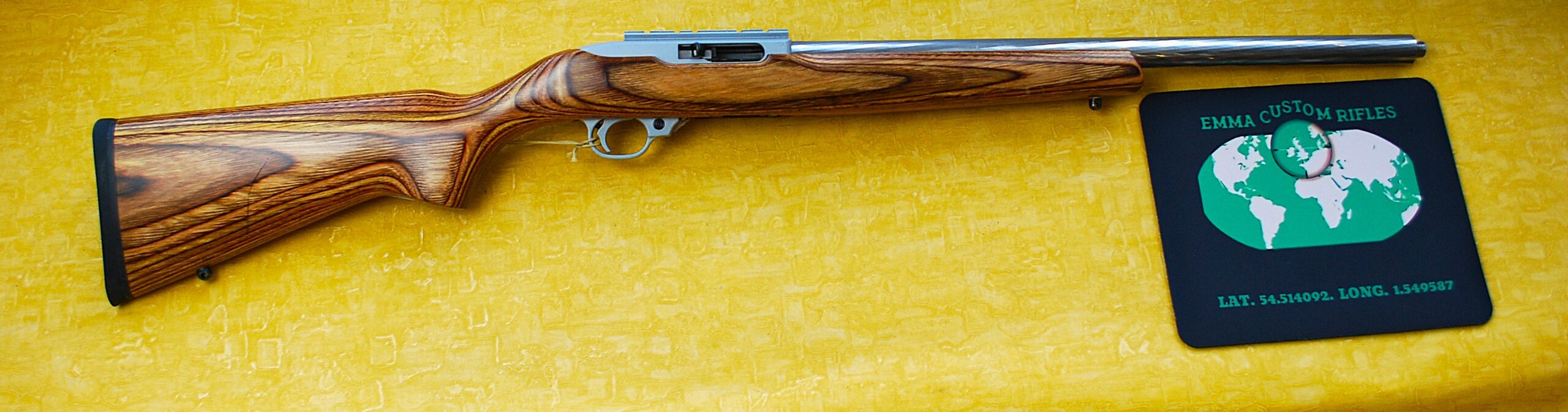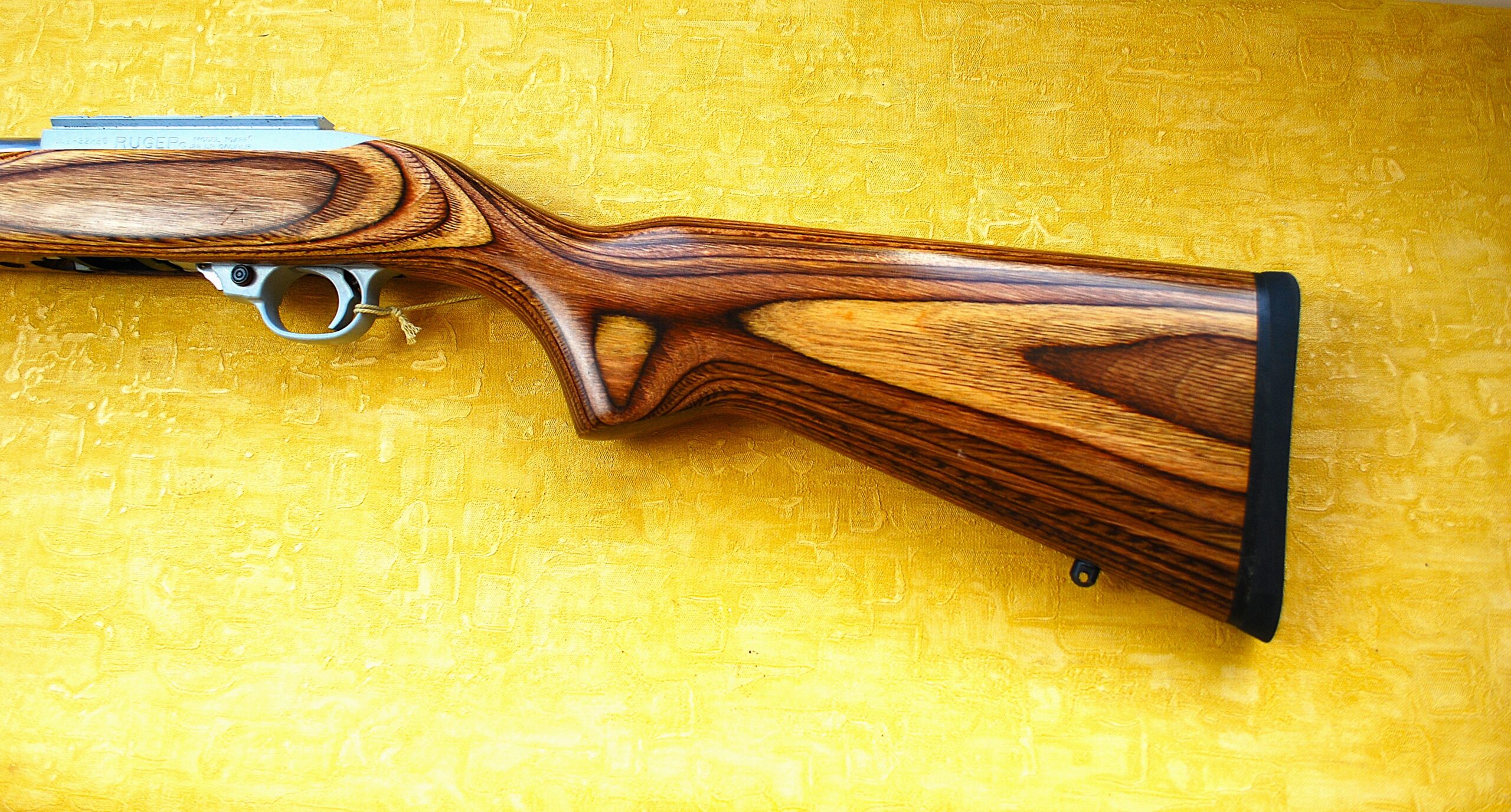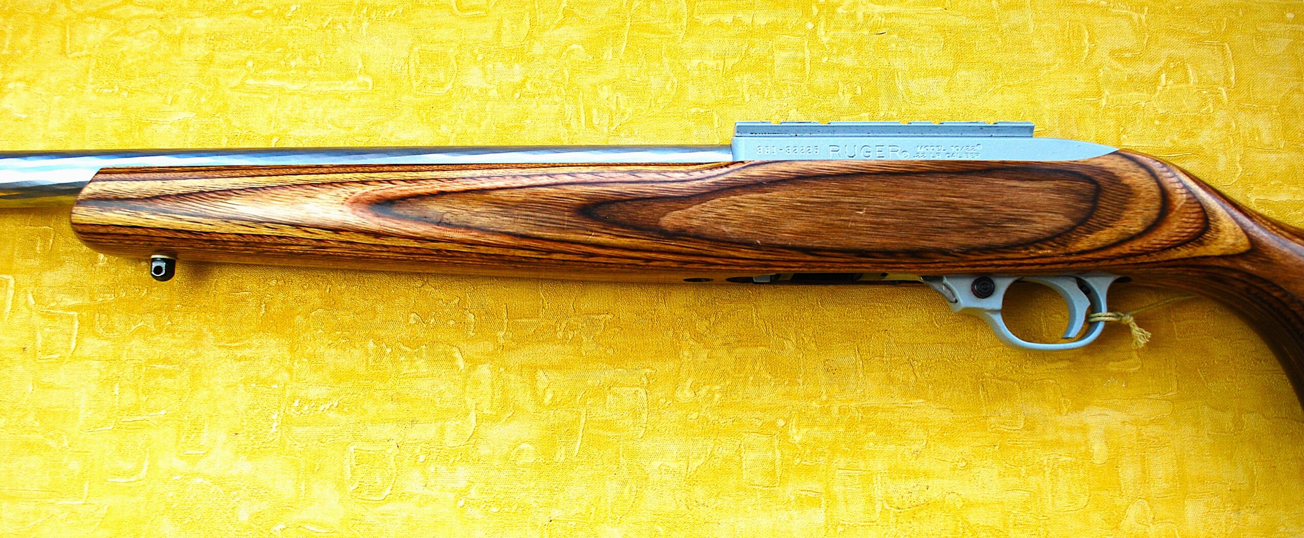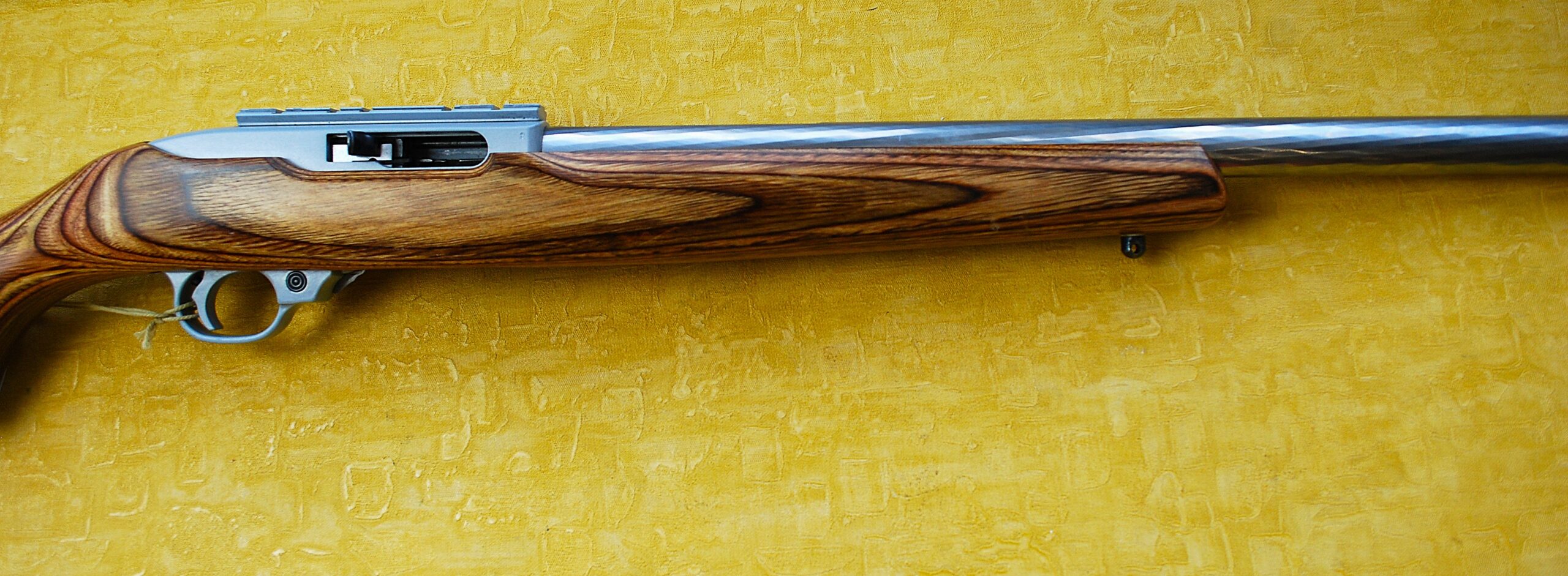 Heavy Stainless-Steel Target / Varmint weight Ruger 10-22 Semi-Automatic Rifle in a Brown Laminate Stock. Matching Light Grey Alloy Receiver Action Housing with the rest of the metalwork in Matching Stainless. That includes the trigger unit and guard plus the action slide etc.